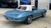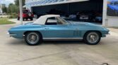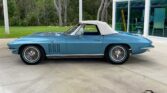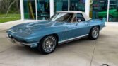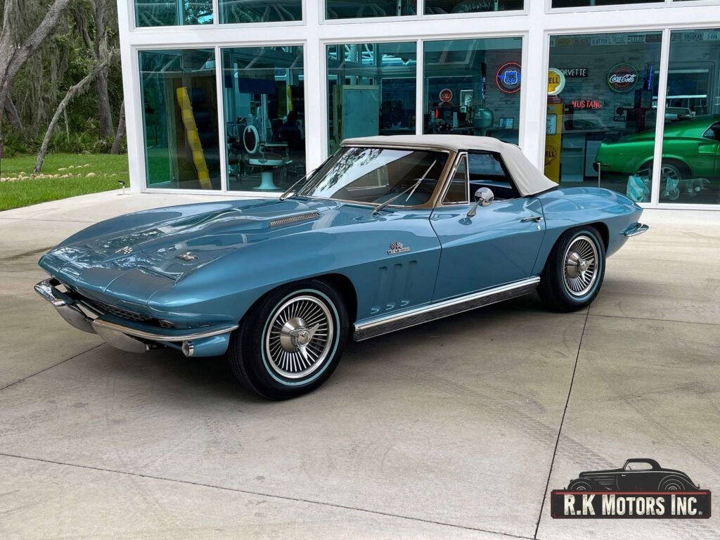 Restored 1966 Corvette 427 with a 4-speed manual, Nassau Blue paint, blue leather interior, factory gauges, wood steering wheel, special 427 hood, chrome trim, and Knock-Off wheels. A true classic.